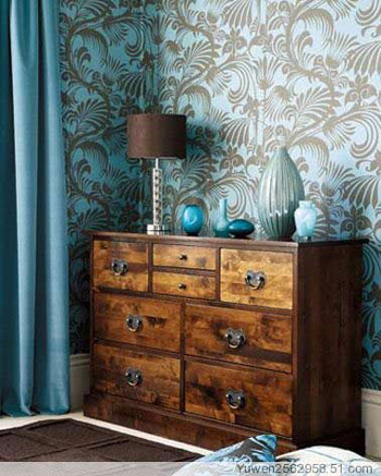 在這里,古樸與張揚(yáng)和諧共存,泛黃的銅環(huán)抽屜與藍(lán)底黑紋墻紙并不突兀。新與舊的家具、墻紙、飾物互相映襯,相得益彰。