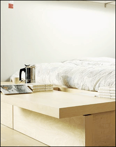 木質(zhì)的小幾,顏色、設(shè)計風(fēng)格與床保持高度一致,簡潔至極,特別之處在于桌面的設(shè)計,皮質(zhì)坐墊和木質(zhì)托盤平分秋色,托盤里可以收納一些零碎的物品,如書寫筆、記事本等,而皮質(zhì)坐墊可以隨時拿下。