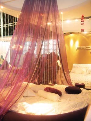 浪漫,只有跟最愛的人在一起,才能體會(huì),才是現(xiàn)實(shí)。張麗星家具展廳里最打眼的,當(dāng)屬這款兩米見方的安吉思情人大圓床:大紅色的床身、高垂而下的紫色幔帳,隨手可觸的黃色海綿抱枕,看到這充滿浪漫情調(diào)的盛滿愛的溫床,你多想像《浪漫櫻花》里一樣,和自己心愛的人一起,體味這種相濡以沫的浪漫。