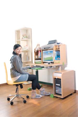名家具展展出的“奪標(biāo)”、“愛王”品牌家具的升降電腦桌,便是一款頗受歡迎的新品。這款?yuàn)Z標(biāo)安全手搖或提拉升降計(jì)算機(jī)桌,配備有文具收納功能之鍵盤架、電線集線槽、四個(gè)桌腳微調(diào)高度等功能;而多功能書架則可在3秒內(nèi)變身計(jì)算機(jī)架,還有可上下調(diào)整的層板、左右微調(diào)的隔書板、旋轉(zhuǎn)的文具盒、活動(dòng)的讀書板、防傾倒的固定夾、多片CD架、高明流護(hù)眼燈具等不一而足,條理清晰而便捷使用,考慮地?zé)o微不至卻適合孩子的生理機(jī)能,不失為孩子們學(xué)習(xí)的一個(gè)好平臺(tái)。