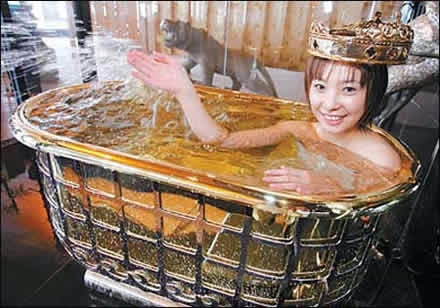 日本東京一家連鎖飯店展示了一款用18K黃金制造的浴盆。浴盆長1.2米,深度65厘米,制造時(shí)消耗了50公斤的黃金,價(jià)值1.2億日元(約合110萬美元)。