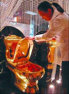 2005年一套近似天價(jià)的18K金意大利宮廷潔具亮相北京,并以當(dāng)日兩套訂單的驚人業(yè)績?yōu)榧揖咏ú氖袌鲎⑷肓艘会?**。在這個(gè)來自于意大利宮廷潔具品牌唯雅妮專賣店看到,由一件標(biāo)價(jià)38.8萬元的馬桶和一個(gè)標(biāo)價(jià)35.8萬元的面盆組成的這套金潔具被置于用潔白的水晶吊簾營造出的一個(gè)專門展臺(tái)內(nèi),顯得金碧輝煌。