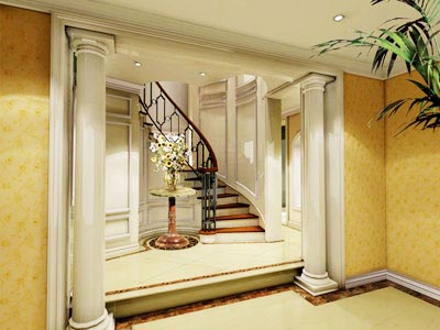 完全通過(guò)改造增加出來(lái)的圓形樓梯間,進(jìn)入客廳最顯眼的就是它,兩根純大理石的塔斯干柱式是上好的西班牙米黃制成。紫羅紅的踏步,簡(jiǎn)約古典的鐵藝造型,法國(guó)紅櫻桃的欄桿扶手加上白色弧形護(hù)墻系統(tǒng),讓樓梯間端莊大氣。