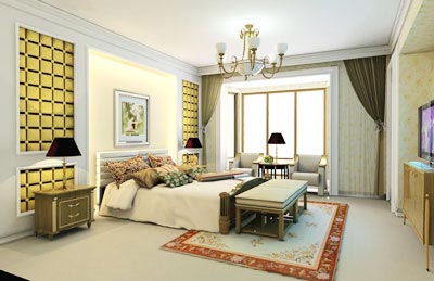 依然延續(xù)了整體歐式風(fēng)格,白色混油加上金色軟包,米色暗花墻紙,淺駝色地毯,暗金色窗簾配以金漆古典吊燈,營(yíng)造出富貴溫馨的氛圍。