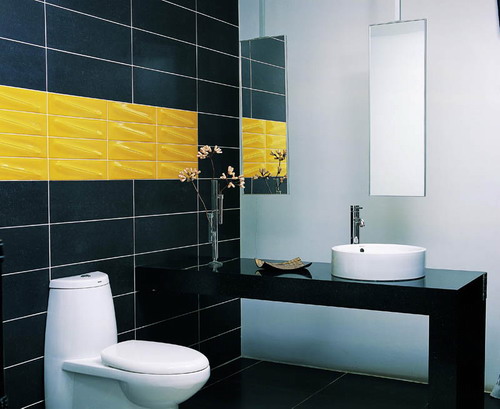 視覺的享受更多的來自于色彩和線條的和諧搭配,瓷磚是衛(wèi)浴空間中色彩和線條舞動的最大載體。在暗色瓷磚中橫向加入一條明黃色花磚,小空間的沉悶感立刻一掃而光?;ùu表面凸起的斜紋,不僅打破衡平豎直的線性關(guān)系,還使得墻面充滿張力。色彩的對比與線條的對比,是使小衛(wèi)浴看起來時尚而有設(shè)計感的關(guān)鍵。