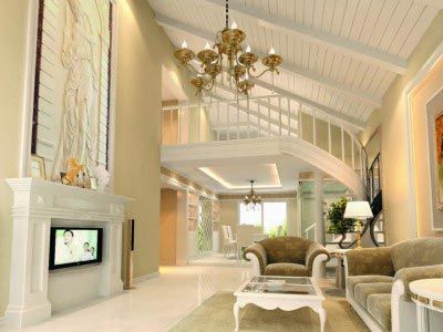 從花園進(jìn)入客廳,田園風(fēng)格繼續(xù)延伸,設(shè)計師大面積地運(yùn)用白色與米色。白色水曲柳拼板的斜頂天花,素白的天然石壁爐,精致的原木雕花扶手,細(xì)膩的石線條,大面積的米黃色墻紙,象牙般的地磚,再結(jié)合白色、米色家具,整個格調(diào)溫馨浪漫,既有西歐廳堂的大氣,又充滿著田園的風(fēng)味,氣質(zhì)高貴,格調(diào)高雅。