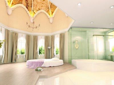 主臥室的設(shè)計很有特點(diǎn)。設(shè)計師利用原有建筑的八角尖頂采用了哥特式的建筑風(fēng)格而設(shè)計了天花頂。睡在圓形床上往上看,天花頂上的古典油畫讓人充滿遐想。半開放的浴室更是讓人沉醉,躺在圓形浴缸里品味著紅酒的芬芳,聽著優(yōu)雅的音樂,讓人忘記了所有的煩惱和工作的壓力。