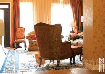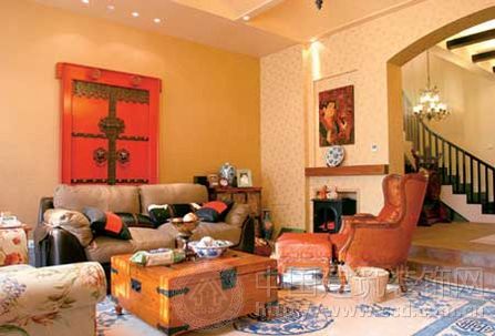 誰(shuí)都躲不過(guò)這迎門第一眼的門中門——仿古朱門 裝飾安排在正廳正墻的正座沙發(fā)上方,主人彰顯的個(gè)性呼之欲出。在暖黃色系的溫柔中,典型的西式沙發(fā)圍繞著中式箱臺(tái),美式壁紙上的小花映襯出地毯上的景泰藍(lán);唐人畫下鐵皮壁爐的火正旺,燃燒著一派英倫風(fēng)采。陶瓷碗錯(cuò)落著歐典盤,雕花櫥柜旁停著手工編織籃——從家具到軟裝,從材質(zhì)到家紡,僅是客廳一處便盡覽中式、新古典、美式鄉(xiāng)村、歐式等諸多風(fēng)情。這似乎漫不經(jīng)心的隨意設(shè)計(jì),卻自然地和諧在一派輕快溫馨的調(diào)子中,給人第一眼的驚鴻一瞥后,又情不自禁地去尋味每一件家居品位,似乎件件都有一段故事,這就是混搭家裝的魅力。