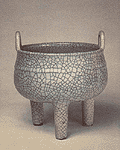 南宋 官窯粉青釉弦紋瓶 哥窯 宋代五大名窯之一,在浙江龍泉。燒制的青瓷有各式碗、盤、瓶、爐等,造型幽雅有古韻,典型器物有琮式瓶、貫耳瓶、鬲式爐、蓮瓣碗等。有的器物有刻劃、堆塑等裝飾,哥窯瓷采用多次施釉的工藝,使青釉濃厚青翠,色彩幽深,創(chuàng)出了粉青、梅子青等絕頂釉色,把青瓷的美,推到了一個(gè)新的境界。哥窯青瓷釉上有細(xì)碎的開片,稱作“百圾碎”,更小的叫“魚子紋”,把原本是缺陷的開片變成瓷器表面自然天成的裝飾,說明工匠們已經(jīng)掌握了開片的規(guī)律,可以人為地加以控制和利用,這只有在制瓷工藝達(dá)到高峰的宋代才能做到。