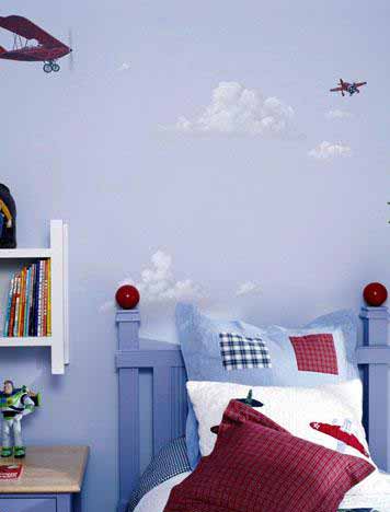 天藍(lán)色的背景,生動的傳達(dá)了一個小男孩想插上夢想的翅膀。墻壁上栩栩如生的畫著天空的云彩和飛機(jī),每朵云和每架飛機(jī)都是形態(tài)各異的。藍(lán)色的家具融入在藍(lán)色的背景里。床邊的白色架子是收藏故事書絕佳的地方。