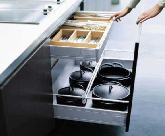 新型聯(lián)動(dòng)裝置取代了齒輪聯(lián)動(dòng),進(jìn)而誕生了櫥柜內(nèi)外雙置物架,這種雙置物架有個(gè)可愛的名字,叫做“怪物籃”?!肮治锘@”的門上有一些存放物品的置物架,打開柜門,聯(lián)動(dòng)裝置會(huì)將柜體深處更大的金屬物架一并帶出,整個(gè)柜子里的物品便一目了然,上年紀(jì)的人找東西再也不必蹲下甚至跪下身子了。同時(shí),側(cè)板還分擔(dān)了鉸鏈的負(fù)荷,結(jié)構(gòu)更加牢固。