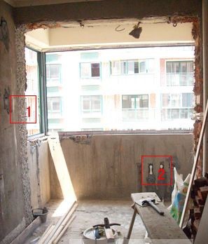 此工地還處于基礎(chǔ)的水電階段,從圖中能看到仍然裸露在外的管道線(xiàn)(2)。從圖中可以看出,陽(yáng)臺(tái)被打通后擴(kuò)大了廚房面積,使空間顯得不那么擁擠,圖上能清晰地看到被敲掉后的墻面痕跡(1)。