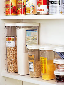 用同樣形狀的容器盛散裝物品會(huì)比較節(jié)省占地空間,如果是食品的儲(chǔ)藏,請?jiān)谌萜魍饷尜N好標(biāo)簽。