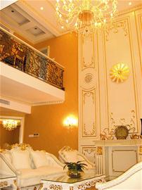 這是一個(gè)現(xiàn)代風(fēng)格的家,處處都流露出與眾不同的精致,而設(shè)計(jì)師只是在最適宜的地方恰到好處地運(yùn)用了一些新穎的裝飾材料及工藝,從而讓整套居室頃刻間靈活、生動(dòng)起來。但是最絕的莫過于客廳的背景墻了,這里也是本套別墅設(shè)計(jì)中的最大亮點(diǎn)。客人從進(jìn)入別墅的剎那間,最能感受的就是這里別樣的風(fēng)景了。原來,客廳背景墻采用了進(jìn)口品牌的裂紋漆等特殊工藝,形成了色調(diào)的對(duì)比和凹凸有致的立體效果。在此,雕花與描金工藝的適當(dāng)運(yùn)用,增添了金粉飾家的味道,華貴之氣立顯。除此之外,設(shè)計(jì)師還很好地運(yùn)用了歐式風(fēng)格的一些裝飾元素,再配以為之量身定造的新古典裂紋沙發(fā),以及與之相匹配的地毯、窗簾等,整體效果渾然天成。