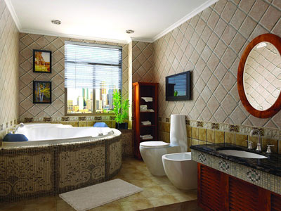 如何使寬大的衛(wèi)生間突出品位?裝修精致而不繁瑣,追求個性和舒適當(dāng)然必不可少。拋棄中規(guī)中矩的長方形浴缸,扇形浴缸獨(dú)占衛(wèi)生間一角,顯得大氣、厚重。為了凸顯品位,那就用馬賽克“雕”出精美的裝飾吧,仿古磚的墻面搭配浴缸馬賽克的仿古花紋,不經(jīng)意間透露了主人對品質(zhì)生活的追求?!?FONT face=Verdana>