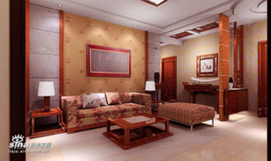 小湯山“靜之湖”別墅的應(yīng)先生對中國畫頗有喜好,有一張1.8米寬、3.5米高的巨幅國畫,北京闊達(dá)裝飾大鐘寺分部的設(shè)計師王瑋從應(yīng)先生的個人愛好入手,將中式元素融入設(shè)計理念,利用5.3米高的挑空,一方面用棕黑色橡木擦漆做畫底,中間穿插銀色金屬線條,下端為啡網(wǎng)理石制作的地臺,造就直線條所產(chǎn)生的大氣;一方面將棚頂設(shè)計成天青色電動鋁制窗簾,中間為棕黑色擦漆木梁,同時讓明亮的前窗與電動窗簾相輝映,拓展恢弘的氣勢。地面與主墻的飾面板則選用暖色調(diào),為整個客廳平添了樸實而又潤澤的色彩感覺,也使氣勢恢弘的中國畫得到了很好的體現(xiàn)。