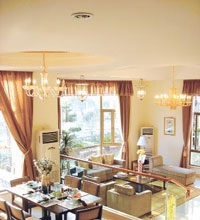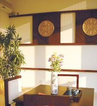 從玄關(guān)望去,整個(gè)廳堂呈橫放的長(zhǎng)方形格局,空間錯(cuò)落有致,分成玄關(guān)、客廳和茶室、餐廳三錯(cuò)層。玄關(guān)是三錯(cuò)層中最高的一層,站在這里,可以縱覽稍低層的餐廳、客廳和茶室,給人以大氣的感覺。餐廳夾在客廳與茶室的中間,客廳與餐廳處于同一平面,而餐廳在它們中間凸起,形成躍式餐廳,將原來一個(gè)整體空間自然隔成了三個(gè)空間,其間以玻璃材料作間隔,而餐廳與茶室之間只有空間的躍式感,如此形成彈性空間,既可充分享受空間的最大尺度,又不會(huì)因?yàn)榭臻g過分開敞而顯得沒有層次,以致產(chǎn)生疏離感。