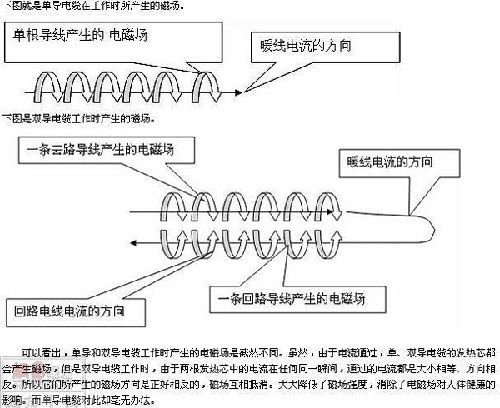 電采暖消費者最關(guān)心的是關(guān)于電磁輻射的問題,每個品牌都會有解決電磁輻射的辦法,但電磁輻射的削弱量卻因各品牌的解決方法不同而各有差異,從目前來看,兩根發(fā)熱暖芯同時發(fā)熱的雙芯的暖線通過一去一回的回路形成封閉式的電磁場,才能最大限度的解決電磁輻射的問題,目前市場上有一些品牌只是采用的一根發(fā)熱一根不發(fā)熱的所謂的雙芯暖芯來解決這個問題,迎合消費者和市場雙芯暖線的銷售概念,但并不解決真正的電磁輻射的問題: