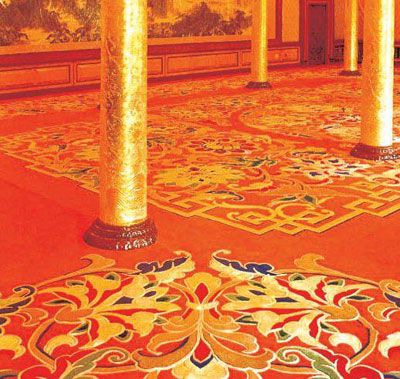 概要: 手工地毯以純手工制做,多以純羊毛和真絲為材料,前后經(jīng)過圖案設(shè)計(jì)、配色、染紗、上經(jīng)、手工打結(jié)、平毯、片毯、洗毯、投剪、修整等十幾道工序加工制作而成。它可以將幾十種色彩和諧地糅合在一起,緊密精致的毯面可以使地毯的壽命延長(zhǎng)到幾十年上百年。如此繁瑣的工藝,使得制做一塊毯子的時(shí)間需要從幾個(gè)月到一兩年不等。