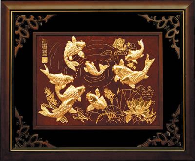 繪有九條魚圖(“九”取長久之意?!棒~”取萬事如意。九條可愛的魚在嬉戲,寓意吉祥),畫有三只羊的三羊圖(有一成語“三陽開泰”,“羊”取其音,變成“陽”,而“泰”是易經(jīng)中的一個召福卦象,意思為招來吉利之謂,可以帶來好運(yùn)),或者是柔和的風(fēng)景畫,如日出、湖光出色、牡丹花等。還有顏容不得親切,表情祥和的仙佛以及“百鳥朝凰”、“青蛙戲水”、“猴王獻(xiàn)瑞”、“百駿圖”等都比較適宜掛在室內(nèi)的。