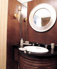 整體風格:選用了中國傳統(tǒng)家具中多見的黑色為主色調(diào),整體效果沉穩(wěn)大氣。雙人面盆使用起來舒適而不擁堵。因為空間較大,所以使用了浴缸,與主人的身份也很相符。整個設(shè)計中,墻面以豎線條為主,這樣使人感覺層高增加,擴大了衛(wèi)生間縱向的空間感。