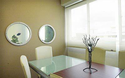 面向飯廳的那道墻上,設(shè)計(jì)師特地以兩個(gè)圓圈玻璃勾畫(huà)魚(yú)缸,宛如在船上透視海底世界,別有一番情趣。