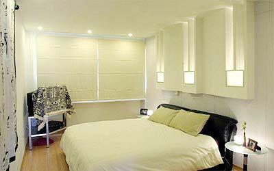 從房門(mén)進(jìn)入,就是睡床所在之處。這里的色調(diào)以乳白色為主,床頭墻壁的設(shè)計(jì),融入柔和的燈光,配上兩旁宛如小蠟燭的床邊燈,使得整個(gè)房間的氣氛變得額外祥和。