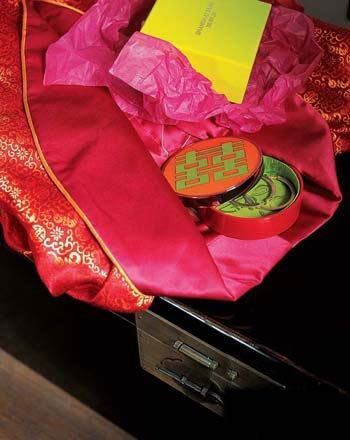 中國(guó)紅的綢緞床蓋,喜氣又奢華,奠定了整個(gè)臥室的婚慶基調(diào)。而床頭柜上的花鳥(niǎo)紋紙巾盒,美人斛中盛開(kāi)的鮮花,墻上掛的刻有花形紋的木器,這一切與床蓋上的月圓雙喜圖,相映成趣了一片真正的花好月圓。