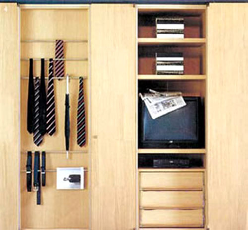 優(yōu)缺點(diǎn):比較好的一種形式是利用一面空墻存放,不完全封閉。優(yōu)點(diǎn)是空氣流通好,寬敞。不過缺點(diǎn)是防塵差,因此防塵是此類衣帽間的重點(diǎn)注意事項(xiàng),可采用防塵罩懸掛衣服,用盒子來疊放衣物。為便于區(qū)別,可增加一些標(biāo)志。若多設(shè)一些抽屜、小柜,則更為實(shí)用。