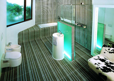 在沙丘中看到水流和金屬元素一定倍感清涼,博洛尼設計師利用人們對沙丘表現出灼熱和干燥的思維定式和代表清涼的元素進行對比后產生的效果會使涼爽的感覺無限加倍。塑造清涼衛(wèi)浴空間利用對比的方法簡單易行。