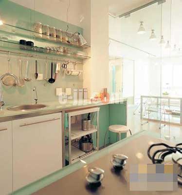 原本極為普通的水泥地面,因?yàn)榍渡狭擞昊ㄊ悴噬袡C(jī)玻璃塊,立即變得活靈活現(xiàn),讓人見之不禁想擺脫鞋襪的束縛,光著腳丫在上面重溫一下海邊嬉戲的快樂。重新筑建的取代整體櫥柜地位的水泥墻體也毫不遜色,開放式的格局設(shè)計(jì),冷熱光源的區(qū)分,讓存儲(chǔ)柜亦是展示柜,廚房小家電及器具既得到了安身立命之所,又成為狹小空間的裝飾點(diǎn)綴。與其它風(fēng)格相比,“一”字型和“L”型簡(jiǎn)約風(fēng)格的整體櫥柜更加適合這種封閉式的廚房空間。以直線條為主的整體櫥柜,因磨砂玻璃的加盟,有效地實(shí)現(xiàn)了期盼已久的瘦身,從視覺上為廚房減少了一些擁擠感,并為不甘寂寞的早餐桌騰出一席之地;絢麗的櫥柜飾面,不但可以激起人的食欲,在縱橫馳騁于白色瓷磚間的同色調(diào)的勾線和窗簾的配合下,徹底消除了沉悶的封閉氣氛。