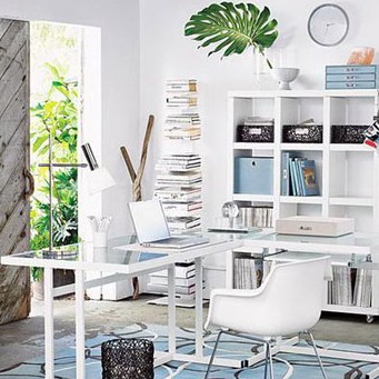 無論書桌與電腦臺是否連接,“L”形的臺面是最適合工作與上網的工作臺首選方案。臺面下一定要有一個足夠大的鍵盤架,最好能放得下鼠標,為了能讓雙足有充分的伸展空間,臺面下能空則空,最多加一個小推柜即可。如果有空間,在電腦臺旁擺放一個半高的小文件柜或書架,或是在工作臺的墻面上搭幾塊隔板,就會讓文件、書籍、光盤的拿取變得輕而易舉。