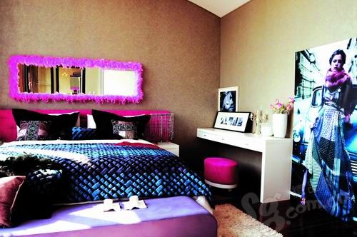 3.主臥室低調奢華的感覺主要靠軟裝來體現(xiàn),比如波希米亞風格的床品、波斯風格的靠墊、背景墻上粉色羽毛及水鉆床頭燈。這個房間有濃濃的英倫范兒,其實就是墻上的一幅背景畫創(chuàng)造成。這糅合了唯美、叛逆、優(yōu)雅、浪漫、迷醉的氣質,會讓每個人心動。