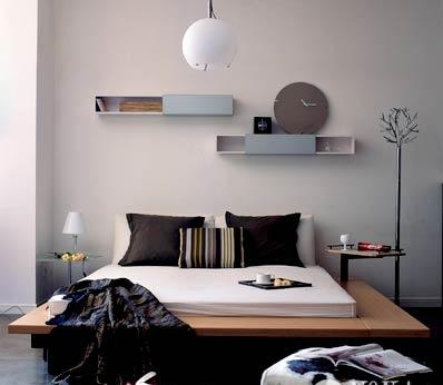 利落的線條充滿整個(gè)房間,原木色的寬邊床可移動(dòng)的小幾設(shè)計(jì)周到,背景墻上錯(cuò)落安置的CD架,利用材料的多元變化和幾何造型的有機(jī)融入,讓視覺(jué)呈現(xiàn)出舒緩的起伏,金屬衣架豎立要床旁,既實(shí)用又強(qiáng)調(diào)了空間的設(shè)計(jì)感。