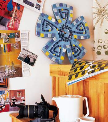 一款普通的花形掛鐘,因為馬賽克的參與而精彩。馬賽克拼花在視覺上給人美感,由于沒有填縫,高低錯落更有一種立體感,當嘀嗒嘀嗒的聲音把你的目光吸引到這朵花上的時候,你是否聞到春的氣息?