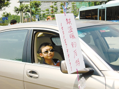 當(dāng)天下午2時許,這名戴著墨鏡的小男孩,一臉稚氣地坐在一輛嶄新的寶馬車副駕駛座上,從車窗里伸出一個用衣架做的釣竿,吊著一塊白色泡沫板,上面寫著“ 缺溫暖,釣后媽”六個鮮紅的大字,并留下了手機號。而泡沫板下端則吊著一根魔術(shù)熒光棒做成的“魚餌”。每當(dāng)小男孩見到有好奇的市民停下來觀看時就顯得特別興奮,不?;蝿印棒~竿”,并把告示舉得高高的。