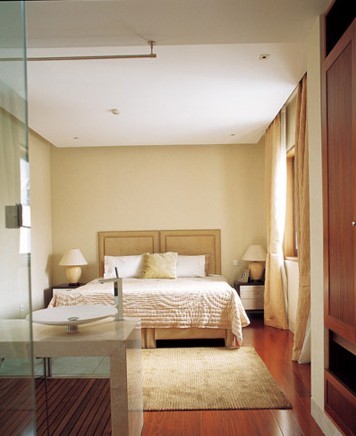 衛(wèi)生間和臥室一墻相隔,也算隸屬于臥室,因而它們間的聯(lián)系也是密切的??臻g不大,就在結(jié)構(gòu)上下工夫,譬如衛(wèi)生間的管道在被墻體包住后雖然沒有與原有的墻體間成一線,但這個空間卻可完全利用起來,變成臥室空間里的梳妝臺,讓缺點經(jīng)由合理運(yùn)用后成為優(yōu)勢。