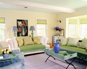 這也是用了一組亮度相同的相鄰色以條紋組合的形式出現(xiàn)在客廳的一面墻上,而這面墻相鄰的兩面墻分別刷成彩色條紋里的粉紅色和粉藍(lán)色。沙發(fā)和兩個(gè)坐凳的外套配備了和彩色條紋里相同的幾種顏色以隨時(shí)更換。房間里還使用了幾塊圓形的彩色地毯,這是因?yàn)榈孛娴念伾珳\,所以用彩色地毯來(lái)平衡。沙發(fā)套換成了綠色。這并沒(méi)有改變房間的大氣氛,但細(xì)節(jié)的變化能讓追求家居品位的人癡迷不已。