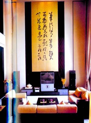 心理學(xué)研究表明,垂掛式裝飾特別是形體修長(zhǎng)的元素容易給人靜謐的感覺(jué)。因此,可在居室中適當(dāng)運(yùn)用垂掛式裝飾。在客廳或書(shū)房墻壁懸掛一兩幅內(nèi)容簡(jiǎn)潔的中式條幅字畫(huà),不僅能增加居室的雅致氛圍,還能讓人不自覺(jué)地安靜下來(lái)。在陽(yáng)臺(tái)上懸掛風(fēng)鈴等小小掛件,偶爾隨風(fēng)輕擺,悅耳的鈴聲也能讓人神思悠遠(yuǎn)。