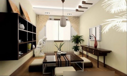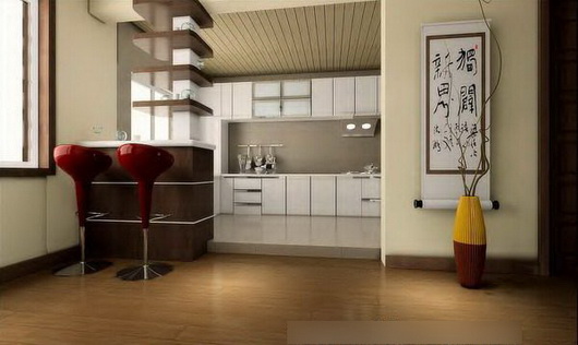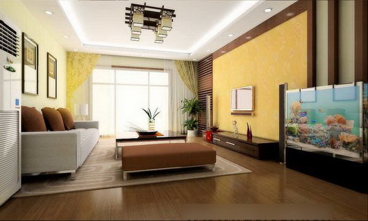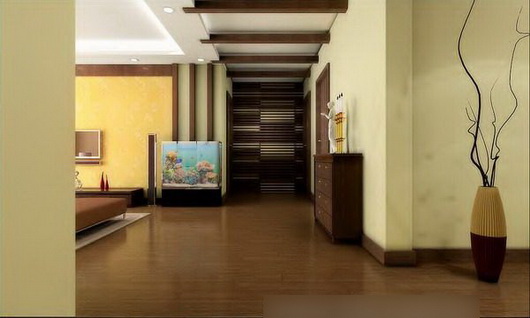 客廳的處理采用了大氣的回廊型吊頂,電視墻采用中式古典的立柱,以及具有中國傳統(tǒng)文化氣息的“印章”(壁紙)處理方式,再加上中式吊頂和胡桃木色的地板,簡約中略帶中國風(fēng);整個客廳的亮點是立柱下的魚缸,它擺放的位置正好是整個居室的“財位”,不僅在風(fēng)水設(shè)計中體現(xiàn)中式元素,也給空間增添了生氣。