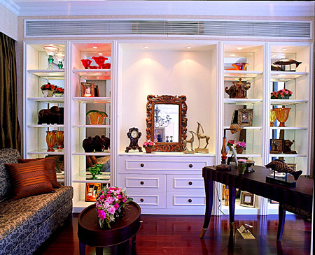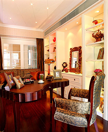 同時(shí)通過(guò)對(duì)稱(chēng)的手法,將書(shū)房設(shè)計(jì)成半開(kāi)放式,在考慮美觀的同時(shí),力求達(dá)到合理利用空間的效果。飯廳處特設(shè)歐式壁爐為裝飾,厚實(shí)沙發(fā)與包布、茶幾的搭配,均體現(xiàn)出古典、豪華的生活氛圍。同時(shí),設(shè)計(jì)師也特別注重主人房洗手間的布局與用材搭配,映襯出濃厚的風(fēng)格定位,室內(nèi)合理利用空間,充分兼顧功能的齊全,營(yíng)造出一個(gè)高質(zhì)量的生活環(huán)境。