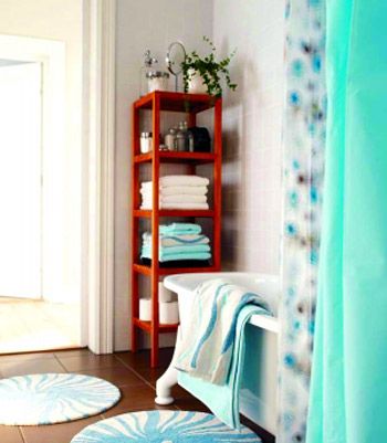 干凈清爽的白磚本身就能帶給人很整潔干凈的感覺,而冰藍和純白色浴簾更在整潔中點綴了一絲涼爽,木質(zhì)的擱架也透露出自然的感覺。