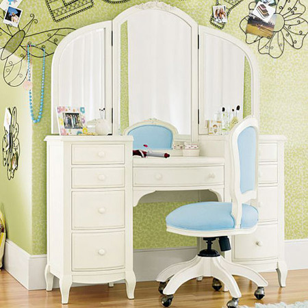 大多數(shù)化妝臺都配有一塊鏡子,一般設(shè)計在桌面以上的位置。但是,也有單配的掛在墻上。如果是這樣,安鏡子的時候就要注意鏡子怎樣安才方便化妝,比如弄成可推拉、可折疊的。如果臺面下有些小抽屜,存放珠寶首飾之類的東西拿出放進(jìn)就會很方便。