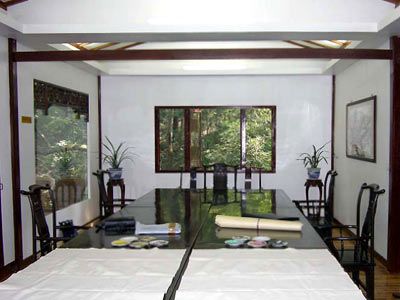 靠窗的書桌,要注意窗外十公尺以內(nèi)其它房屋射入的尖角,尖角距離越遠影響越小,越近影響越大。寫字臺上的工作必需用品,也是書房的裝飾陳列品。如文房四寶的安置,筆筒、筆架的擺放,無不具有很強的觀賞價值且具有裝飾性。