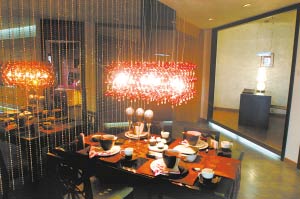 在餐廳的燈和餐具的使用上,特地選擇了白色和大紅色,它們?cè)谏钌AШ秃谏妥赖囊r托下更顯絢麗。