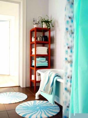 清爽浴室 干凈清爽的白磚本身就能帶給人很整潔干凈的感覺,而冰藍和純白色浴簾更在整潔中點綴了一絲涼爽,木質(zhì)的擱架也透露出自然的感覺。