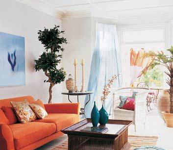 將橙色與綠松石色進(jìn)行大膽的搭配,可以呈現(xiàn)出一種令人震撼的視覺(jué)效果。橙色的大沙發(fā)強(qiáng)調(diào)了整個(gè)空間的主體色調(diào),沙發(fā)上圖案簡(jiǎn)單的花卉靠墊與橙色主調(diào)形成一種呼應(yīng)。泛白的綠松石色裝飾墻,延伸出另一種風(fēng)格的空間。薄紗窗簾使室內(nèi)的光線更加自然柔和,帶有戶(hù)外咖啡座風(fēng)格的藤條茶幾和扶手椅,讓人很自然地感覺(jué)到悠閑與愜意。碰上好的天氣,可以很方便地將他們搬到陽(yáng)臺(tái)上。鐵藝小桌上穩(wěn)固的大號(hào)蠟燭臺(tái)和漂亮的古典式燈籠可以非常方便地為室內(nèi)或室外提供照明。