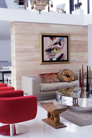 成功在于細(xì)節(jié)。Julian和Trevyn把他們“回歸自然”的設(shè)計(jì)理念貫徹到了每個(gè)角落,他們盡可能地使用自然材質(zhì)裝飾空間:在室外種植的幾盆綠意盎然的大型盆栽,和室內(nèi)桌上擺著的一捧捧白色馬蹄蓮相映成趣。最醒目的當(dāng)屬那個(gè)吊在門口形狀妖嬈的羊角,而室內(nèi)沙發(fā)旁邊兩個(gè)敦實(shí)可愛的純天然圓石充當(dāng)?shù)淖?,不得不讓人嘆為神來之筆。除此之外,用純木制的墻板來間隔室內(nèi)空間,加上比比皆是的原色原木家具,比如墻角處厚重感十足的木制躺椅,還有以一個(gè)方方正正的木墩完成的小茶幾,無一不閃爍著“貼近自然、回歸自然”的純樸思想。