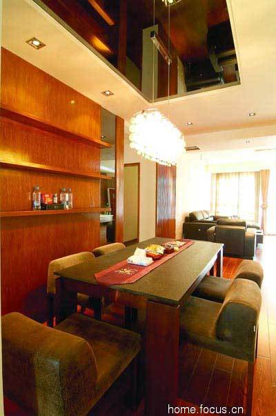 這個(gè)空間以黑、灰、米、白四色為基調(diào)。以現(xiàn)代、典雅、復(fù)古為主題,通過帶有古典韻味的屏風(fēng),把客廳巧妙地分隔成玄關(guān)和會(huì)客廳兩個(gè)實(shí)用空間,大面積的木制墻飾也巧妙地把兩者收納在一個(gè)大的空間內(nèi)。且大面積的灰鏡和帶有復(fù)古氣息的木墻飾也使客廳在穩(wěn)重之外多了一些華麗優(yōu)雅的現(xiàn)代感。木制電視墻將電視線路與視聽器全都收納其中,將雜亂無章化為無形,也是簡約的一種體現(xiàn)。