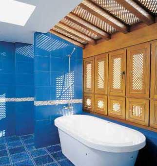 有著鏤空雕刻的窗戶和屋頂,多層次的空間處理不僅視覺效果通透明朗,而且隨著光線的游走還會帶來無窮的光影變幻。在浴室的地磚和腰磚上,用手工畫上愛情海的圖騰。